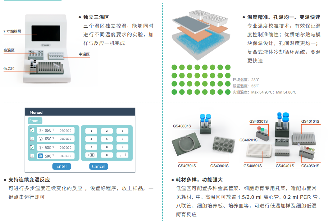 NaCha Pro多溫區(qū)工作臺,是NaCha多溫區(qū)工作臺的升級版,同樣擁有三個獨立溫區(qū),點擊屏幕即可輕松設(shè)置各溫區(qū)的反應(yīng)溫度和時間,推薦用于低溫加樣及中、高溫的溫育反應(yīng)。優(yōu)質(zhì)的帕爾貼與精準的溫度校準技術(shù),配合復合式液體冷卻循環(huán)系統(tǒng),有效保證溫度控制準確性與孔間溫度均一性,實現(xiàn)快速變溫。NaCha Pro 擁有更寬廣的溫度范圍,中溫區(qū)可進行連續(xù)變溫,多步反應(yīng)一臺機器即可完成。同時增加了高溫區(qū) 1.5/2.0 ml 孔的通量,支持多個樣本高溫變性及孵育反應(yīng)。低溫區(qū)可搭配各類金屬管架,進行低溫加樣及細胞低溫孵育反應(yīng),全方位多功能支持您的實驗,獲得穩(wěn)定準確的結(jié)果。