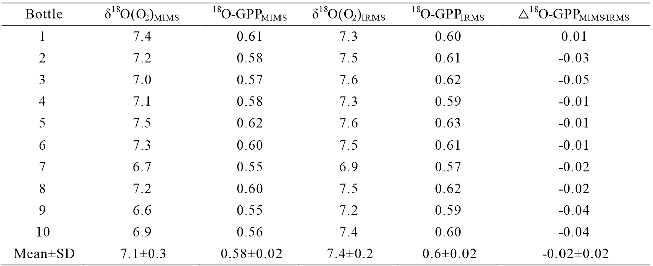 表2 MIMS與IRMS在測量海洋總初級生產力時的數(shù)據(jù)比較