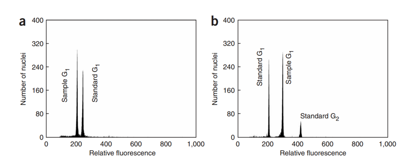 3、樣本基因組大小=待測(cè)樣本的峰值/參照物的峰值*參照物基因組大小(pg/Mb)。