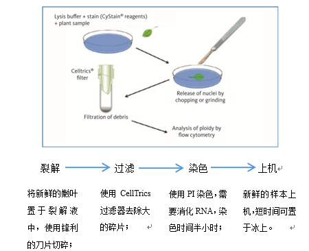 吉源生物采用配置532nm綠色激光的Sysmex-Partec CyFlow Ploidy Analyser,搭配Sysmex CyStain PI基因組大小檢測(cè)試劑盒,僅需半小時(shí),即可完成基因組大小預(yù)估。實(shí)驗(yàn)基本步驟如下: