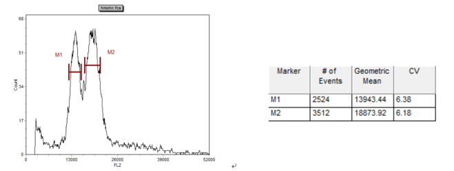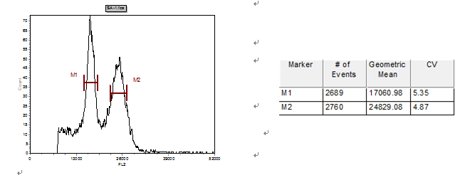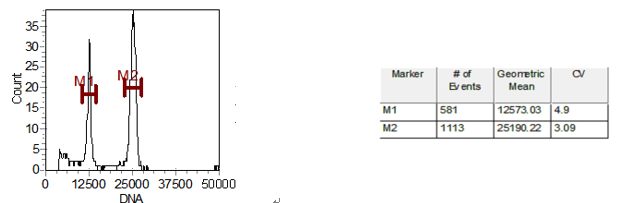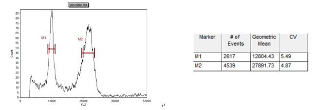 首先需要裂解液將組織中細(xì)胞核釋放出來,并打開DNA鏈,然后用PI染液將細(xì)胞核DNA染色,再用儀器檢測(cè)細(xì)胞核里被染色的DNA發(fā)出的熒光強(qiáng)度。結(jié)果的橫坐標(biāo)表示熒光強(qiáng)度,縱坐標(biāo)表示細(xì)胞數(shù)量,通常來說,信號(hào)峰高說明信號(hào)比較好,雜質(zhì)少。