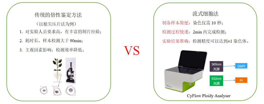 傳統(tǒng)的倍性鑒定主要采用常規(guī)壓片法統(tǒng)計染色體數(shù)目,但采用這種方法很難尋找到分裂中期染色體分散良好并可進行計數(shù)的細胞,而且整個過程耗時長,檢測效率低。采用流式細胞術(Flow Cytometry,F(xiàn)CM)進行倍性分析的方法簡化了倍性分析的過程,可以快速準確檢測同一物種范圍內不同倍性的樣品。FCM作為一項快速、高效的檢測技術,被廣泛應用于細胞分類學、植物遺傳學及植物生理學等研究領域中。FCM常被用于鑒定植物倍性水平,通過檢測植株G0/G1峰的細胞核DNA含量可以判斷出植物的倍性。